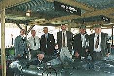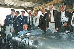 ![]() Stirling Moss tries our ELVA 'works' MkII. (Left-Right) Robbie, Andy, RAD (me), Steve, Charlie, Alan, Tony, Mick, John. |
