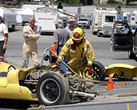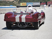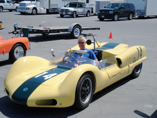 A nice collection of Elvas was among the 140 entrants in the spring HMSA Club event held on the weekend of April 24-25 at California’s famed Laguna Seca racetrack. Of the half-dozen Couriers entered was Bud Byrnes “Monterey Historic” veteran 1963 Elva MK III. The car was a purpose-built racecar delivered to an American in France, who raced it at Clermont Ferrand and elsewhere. It was found in a Georgia Swamp and restored. Bud got the car i8n 2005 and has just freshened the motor and has added the most unusual 3-into-1 exhaust manifold that sports expansion chambers that are computer pulse-rated. The engine work must be working as Bud ran among the first half-dozen cars in his class that included some big-motored production cars. Ken Palmer and Roy Bruckner own the two MK 6 that were entered. Ken has traced the history of his yellow MK 6 all the way back to its beginnings. Rudy Rudolph properly restored it prior to Ken’s ownership. Ken battled Roy the entire weekend and two or three car lengths were all that separated them until Ken’s MK 6 broke a right rear stub axle on the track’s fast right handed Turn 5. He made a spectacular spin around and ended up on the side of the track, in the sand, while the wheel and tire were seen rolling to the other side of the asphalt. Ken was OK but not so the axle and wheel. He will fix them but might have to miss June’s “Sonoma Historics” to which he has been invited. The other MK 6 of Roy Bruckner has finally worked out all its early issues. Roy has replaced the front drum brakes with disc brakes (a Frank Nichols option in 1962) and done some motor work. Replacing the gearbox’s too tall overdrive 4th gear has given the car some top end speed it had lacked. I asked Roy to describe his car and here is his response: