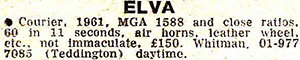 I had been over-driving the Elva for some months and wanted something faster, more refined (with a heater at least) and reliable. So I placed an advert in Sexchange & Mart at £150 which brought three enquiries and I sold it for £180 to a chap north of the M4 who had lived close to the Elva factory years before and had always fancied one. On the 14th May 1969 I blasted the beast up the M4 at 100 mph for the last time just to say goodbye. A couple of days later he rang me to ask where he could get a new cylinder head as he couldn’t keep up with the water leaking from it! Now this was news to me and I couldn’t help him, nor was he seeking compensation, but it troubled me. I eventually recalled there being a mysterious rust line on the head which I had never investigated and I guess that the head had cracked a year earlier on the night I had run out of water driving back to ByC and the blast up the M4 must have been the last straw. I heard no more and have no idea of the car’s fate but guess it is scrapped. There was only one car on my buying list, a Lotus Elan, which will become Part 2 of this tale, entitled “Forty years of bad road”!